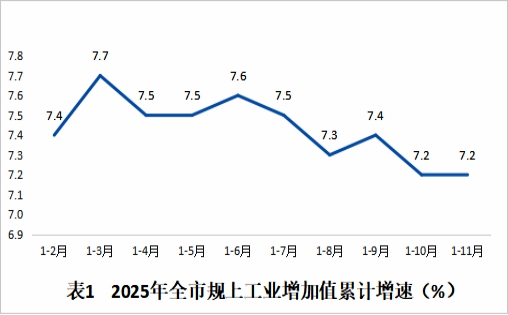 11月份,全市规上工业增加值增长6.3%,比上月提升0.8个百分点。1—11月,全市规上工业增加值增长7.2%,与1—10月增速持平,高于全省平均水平0.6个百分点,列全省第3位。其中,制造业增加值增长7.6%,比1—10月加快0.3个百分点。医药、船舶行业支撑有力,分别增长22.1%、16.5%。增加值排名前十的重点行业中,除电气机械为负增长(-1.1%),其他九个行业均为正增长。
